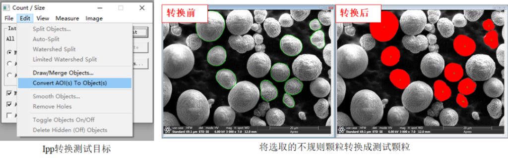 将SEM拍摄的微观结构下的颗粒外形,通过IPP软件测量相关参数,结合公式计算出对应的球形度,最终达到球形度量化的目的。方便实际研发和生产中的对于产品质量的评价和对比,具有很重要的工业生产意义。