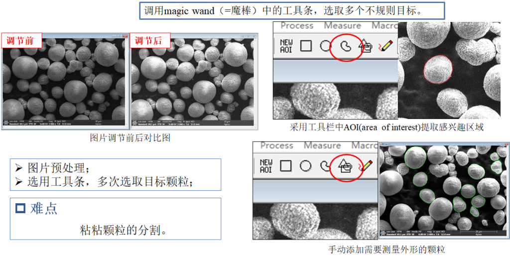 ★颗粒为三维球体,体现在SEM图片中为二维,选取观测面时应该以颗粒中心为观测面中心,选取一定的方形(最好规范统一。)