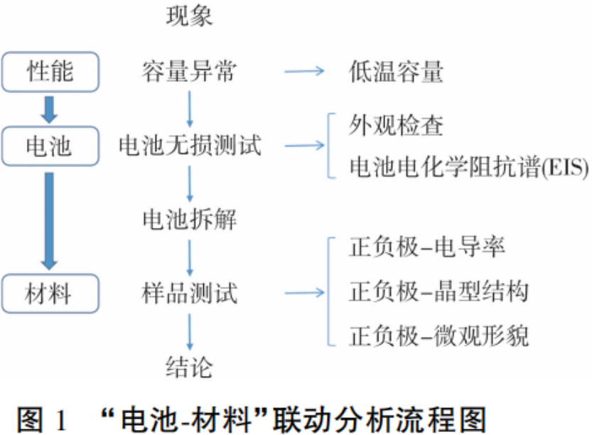 电池-材料”联动分析流程如图1所示。根据电池低温下的容量异常现象,对电池进行无损测试,包括外观、电化学阻抗谱(EIS),再进行电池拆解,了解电池材料特性,结合无损测试结果及材料分析结果,分析电池低温容量异常的原因。
