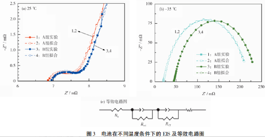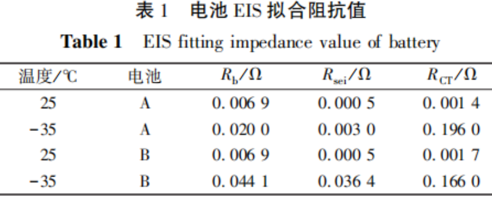 电池在25℃、-35℃的环境温度下进行EIS测试,结果见图3。经等效电路[图3(c)]拟合,将电池的电化学阻抗分为欧姆阻抗(Rb)、电荷转移阻抗(RCT)和固体电解质相界面(SEI)膜阻抗(Rsei),拟合数值列于表1。