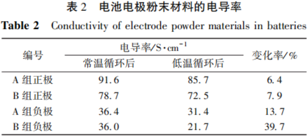 从材料的微观层面来分析低温环境造成电池容量异常的原因,取A、B组经过常温(25℃)、低温(-35℃)循环后的电池,拆解后进行正负极粉末电导率测试,结果见表2。从表2可知,常温测试的A、B组电池中,正极粉末材料的电导率分别为91.6S/cm、78.7S/cm,负极粉末材料的电导率分别为36.4S/cm、36.0S/cm。B组电池正、负极材料粉末的电导率都低A组。