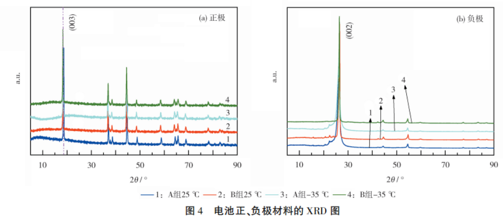 经过低温测试的A、B组电池,正极材料(003)晶面衍射峰峰位都出现向低角度偏移的现象,可能是由于-35℃低温测试对电池三元正极材料的晶体结构造成一定程度破坏,导致结晶度下降。经过低温容量测试后,A、B组电池负极材料的主峰位置没有偏移,(002)晶面衍射峰窄化,材料主体结构没有发生变化。