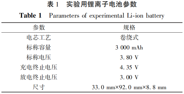 实验采用三元材料软包装锂离子电池,正极活性物质为NCM523,负极活性物质为石墨,参数见表1。实验电池总数为20只,均在25℃恒温箱内静置24h,再进行实验,使内部的活性物质均衡发挥作用。