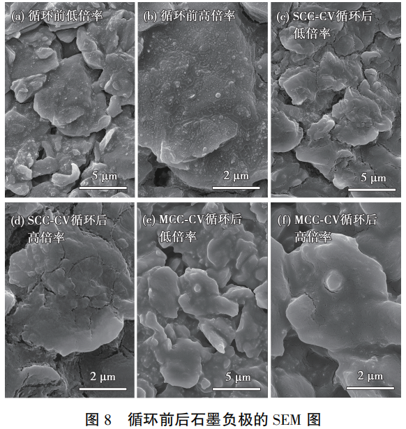 SEM分析表明,SCC-CV快充循环后,正极材料表面有较多的杂质,加速了电解质和正极之间的副反应,导致容量衰减和电化学性能下降。SCC-CV石墨负极材料表面的较大裂纹,阻碍了Li+在循环过程中的嵌脱,导致电池容量降低。