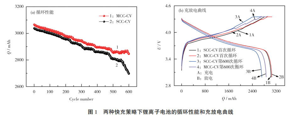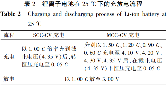 循环充放电测试。电池充放电流程见表2,循环600次。实验用电池的最大充电倍率为1.50C,并通过多次的预实验,最终确定MCC-CV充电的倍率。对两种快充策略下电池充放电的总时间进行监测并分别取平均值,得出SCC-CV和MCC-CV充电的总时长分别为65.0min和63.5min。