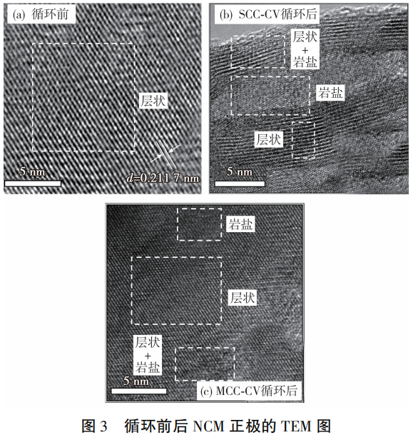 从图3(a)可知,循环前的NCM正极材料晶体是层状结构。经过600次循环后,SCC-CV快充的正极材料晶体呈现大面积的岩盐状结构及混合结构[见图3(b)],而MCC-CV的正极层状结构几乎没有被破坏[见图3(c)]。这说明,在SCC-CV下循环的正极粒子比在MCC-CV下循环的经历了更频繁的表面变化或重构,MCC-CV循环下的Li+可正常从层状结构中嵌脱,从而有更高的容量保持率。分析表明,MCCCV充电可使正极材料具有更高的循环结构稳定性。