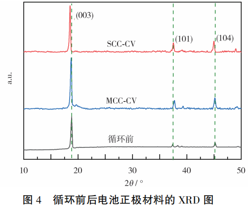 正极材料特征峰(003)强度I003与(104)强度I104的比值(I003/I104)可在一定程度上反映材料的阳离子混排程度,当I003/I104大于等于1.2时,材料的阳离子混排程度较低,层状结构较好。通过jade软件计算得出,电池循环前,NCM 正极材料的I003/I104为1.934,SCC-CV及MCC-CV循环后,NCM正极材料的I003/I104分别为1.335和1.703。这表明,快充导致阳离子混排程度增大,且SCC-CV的正极材料层状结构被破坏得更严重,说明MCC-CV快充策略可保护正极材料,提高电池的循环性能。