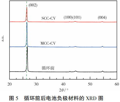 为进一步探究石墨负极材料的结构变化,对锂离子电池循环前以及SCC-CV、MCC-CV循环600次后的石墨负极材料进行XRD分析,结果如图5所示。从图5可知,在两种快充策略下,循环600次后,负极材料的(002)峰都向低衍射角度偏移,说明大倍率快充循环导致石墨的层间距变宽。