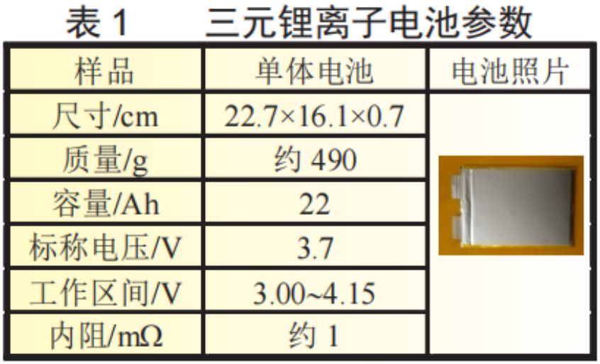 本次研究对象为某公司生产的车用方形软包电池,正极为NCM111三元材料,负极为石墨,标称容量为22Ah,其具体规格参数见表1。