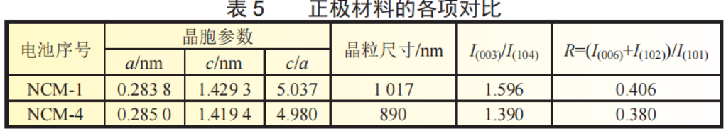 公式计算,表5列出了新旧电池正极材料的晶胞参数、c/a的值、I(003)/I(104)峰强比及R因子[(I(006)+I(102))/I(101)]值强度比值。