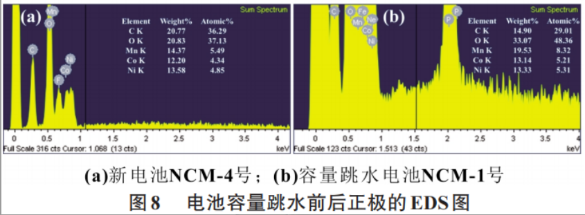 图7是电池容量跳水NCM-1样品的能谱图,NCM三元材料微粒的破裂,结果显示O维持颗粒结构,Ni和Co主要存在于颗粒结构,少许分散于电解质,而Mn元素大量溶解分散于电解质中。对极片表面进行能谱元素分析(见图8所示),电池容量跳水后的正极表面Mn元素含量比例大幅增加,Ni、Co元素含量比例小幅增加。