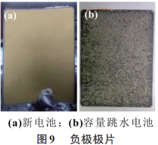 图9是新电池和跳水电池在真空手套箱中拆解后的负极极片对比图。图9(a)为新电池的负极极片,拆解时表面光滑湿润,有少量电解液附着,且负极材料不易脱落。图9(b)为容量跳水电池的负极极片,拆解时极片表面干涸,无液体电解液的存在,表面分布不均匀,石墨出现颗粒粉化且容易脱落,这导致负极石墨材料压实密度降低,增大了极片厚度。结合图2,负极石墨颗粒粉化是导致单体电池厚度增加的主要原因。