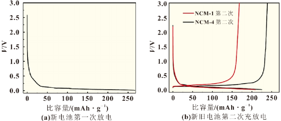 将新旧电池正极极片分别制作成纽扣电池,结果如图4所示。图4(a)是新电池正极极片扣电第一次充电比容量为196.61mAh/g。文献报道NCM正极电池的实际充电比容量在150~220mAh/g,说明本款车用电池正极材料性能较好且制作成的扣电性能优异。扣电循环在第二次开始稳定[见图4(b)],充电比容量新电池正极为125.81mAh/g,跳水后为40.31mAh/g,对比相差85.5mAh/g,得出容量损失率高达67.96%。相比较之下,跳水电池负极材料的容量损失率为7.24%(见下文)。这说明在单体三元电池中,正极材料发生异变,引起电池性能大幅下降。