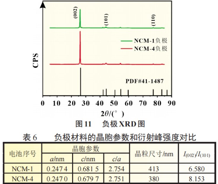 图11和表6是新电池NCM-4号与容量跳水电池NCM-1号负极极片的XRD图及数据,(002)/(101)衍射峰比较明显,证明是层状石墨结构,有利于锂离子可逆地在层间嵌入/脱出。整体峰位未偏移,表明石墨结构未坍塌。(002)峰反映了垂直于石墨片层的远程顺序,随着容量保持率的下降,(002)峰的半峰宽降低,石墨出现粉化,易于从铜箔上脱落。