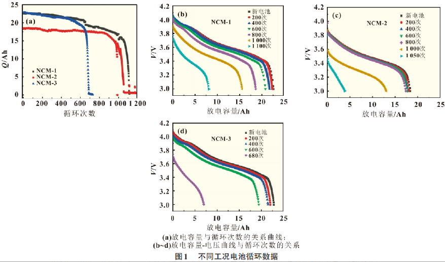 图1是电池放电容量曲线。循环早期三块电池容量下降缓慢,但后期均出现了容量跳水现象。NCM-1号电池0~1 000次每次循环损失约5.72mAh;NCM-2号电池0~850次每次循环损失约1.42 mAh;NCM-3号电池在45℃和2C的高温高倍率条件下,容量损失最快,从开始的22.83Ah到第600次循环的19.42Ah,每次循环损失约5.68mAh。此后,电池容量急剧下降,在第680次循环后容量下降到6.98Ah,从600~680次每次循环损失155.5mAh。这说明三元锂离子电池在高温高倍率情况下,更容易出现容量跳水现象。