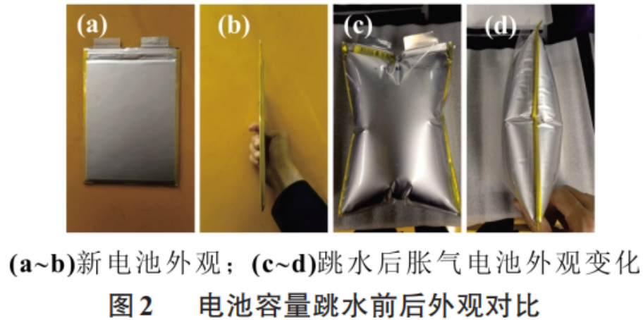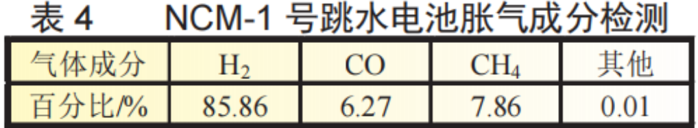 (4)单体电池在发生容量跳水后容易出现胀气现象,主要有H2、CO、CH4等。