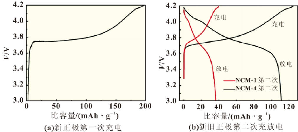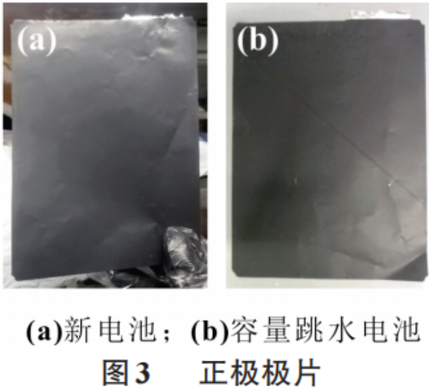 将NCM-1号跳水电池和NCM-4号新电池在真空手套箱中拆解为正极极片、负极极片、隔膜和其他电池构件。图3(a)和(b)是电池容量跳水前后正极极片的对比图,宏观对比电池跳水前后差异很小。但在实际拆解过程中,新电池正极极片表面湿润光滑,有少许的电解液附着,由于电池拆解时间较长及电解液在手套箱中挥发较快,未能及时捕捉表面附着电解液的正极的照片。拆解跳水后的电池,极片表面干涸,说明此时已无液体电解液存在。