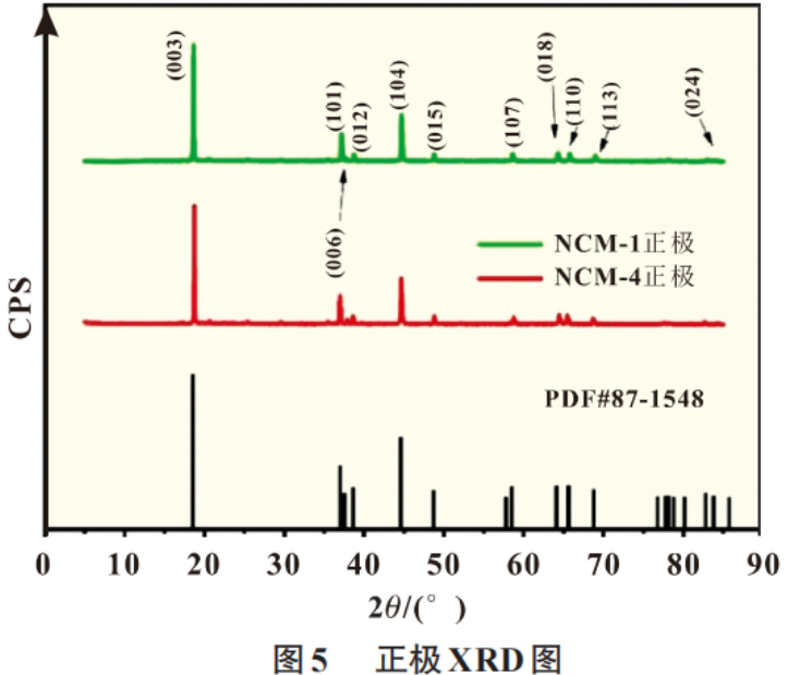 图5是NCM-4号新正极与NCM-1号容量跳水正极的XRD结果。从图中可以看出,新旧电池材料正极的特征峰主要源于材料晶体结构中的Li、Ni、Co 和 Mn的排序,未发现其他杂峰,表明电池在循环过程中没有产生其他异相。图5正极XRD图谱中的衍射峰,除了左右出现的微弱的衍射峰以外,其他衍射峰明显,显示正极材料结晶度较好。同时,从图中还可以看到两对明显的分裂峰:(006)/(012)和(018)/(110),这两对分裂峰的出现,显示正极材料层状结构良好。