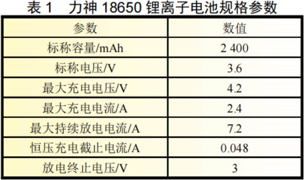 采用力神18650车用动力锂离子电池作为欧姆内阻和极化内阻测试方法的研究对象,其具体参数如表1所示。