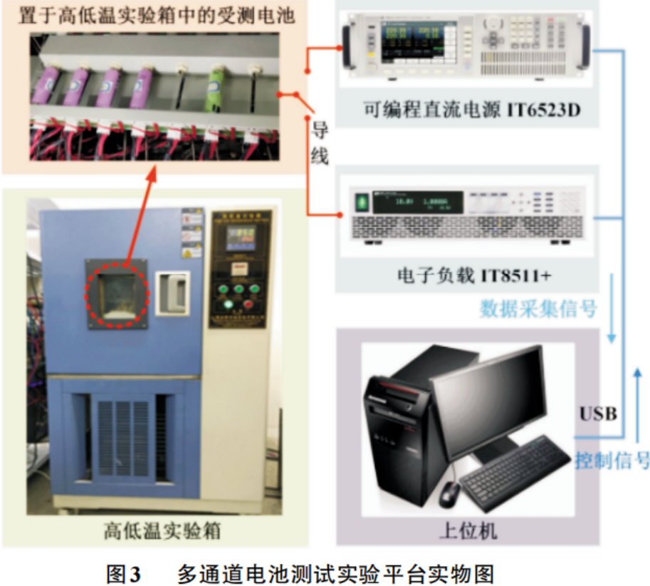 多通道电池测试实验平台如图3所示,主要包括用于控制环境温度的恒温箱,锂离子电池,可编程直流电源,电子负载,测量参数的传感器(电压,电流或温度),电池数据采集器(电池数据包括端电压,负载电流,放电容量和温度)和用于提供人机交互界面、数据储存的上位机。