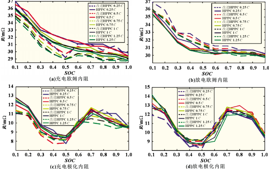 分别采用改进HPPC法和HPPC法对同批次的电池进行实验,测量的电池充放电电流范围为0.25C~1.25C,每0.25C为一个测量点,并对这两种方法测量出来的充放电欧姆内阻和极化内阻结果进行比较分析,测试结果如图4所示。