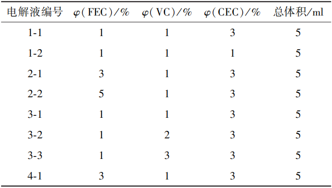 使用的基础电解液为1801型电解液(EC、DMC、DEC、FEC和VC的体积比为0.33∶0.33∶0.33∶0.05∶0.05),溶质为LiPF6(约含12.5%)。在(24±3)℃下将EC基电解液与FEC、VC、CEC等添加剂按表1配制成实验电解液。表1 不同实验电解液的添加剂体积分数