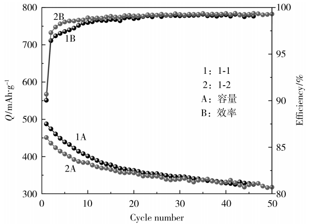 从图1可知,随着CEC添加量的增加,电池的放电比容量增加,库仑效率略微下降。1-1电池的首次放电比容量为488.75mAh/g,而1-2电池的首次放电比容量为449.98mAh/g;1-1、1-2电池的首次库仑效率分别为90.05%、90.70%。由此可见,CEC的添加量会直接影响扣式电池的充电比容量,当添加量为3%时,电池首次放电比容量比添加量为1%时高出近40mAh/g;但首次库仑效率相差不超过1%,说明影响较小,且首次库仑效率均在90%以上,性能满足要求。实验结果表明:当CEC的添加量为3%时,对电池性能有较好的提升效果。