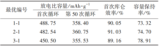 图2 不同FEC添加量电池的放电比容量及库仑效率从图2可知,随着FEC添加量的增加,电池的首次库仑效率和放电比容量明显降低。2-1电池的首次放电比容量为482.54mAh/g,首次循环库仑效率为91.03%;而2-2电池的首次放电比容量低于450.00mAh/g,首次循环效率低于90.00%,此时电池性能不稳定且明显下降,与1-1、2-1电池相差甚远,原因是形成的SEI膜过于致密,损耗过量Li+,且剩余的Li+无法自由通过SEI膜进行嵌脱,导致比容量下降,首次库仑效率下降。由此可知,FEC添加量不宜超过3%。