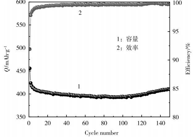 图4 添加量最优比例电池的放电比容量及库仑效率从图4可知,改进后电池的首次库仑效率达到91.90%。经过4次循环,库仑效率已接近100%。负极材料的首次放电比容量为452.60mAh/g,虽低于1-1、2-1电池,但经过150次循环后,比容量保持较为平稳;后期略有升高,可能是因为半电池Si-C负极涂覆较厚,在前期的充放电过程中未能充分地嵌脱锂,经过几十次循环后才能深入地嵌脱锂,Li+在进入硅晶格的过程中,导致硅颗粒粉化为原子态,且随着循环次数增加而增多,比表面积增加,故在后期循环中整体容量会升高。电池的整体的容量保持率能达到86.50%。