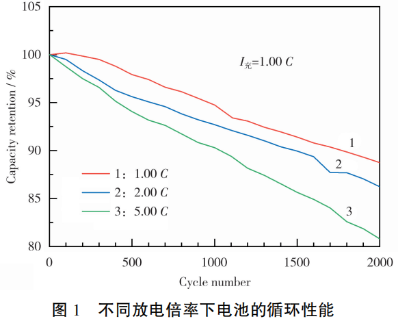 实验在数据中心用电池的基础上展开,该电池的倍率循环性能见图1。从图1可知,相同倍率充电,2.00C放电和5.00C放电循环2000次,容量分别衰减14%和20%,相对1.00C放电循环衰减12%,分别低2个和8个百分点。从循环性能上看,电池具有倍率长循环的特点。