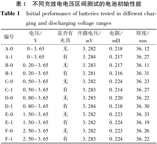 为研究铝壳电池在不同电压区间的过放电特点,对电池进行持续的循环测试,变量为电压区间和电池循环过程中所处的状态:有夹具、无夹具。 分别将电池进行编号,变化内容以及电池的初始状态见表1,电池的荷电状态(SOC)为30%。从表1列举的12组电池30% SOC下初始电压、内阻、厚度看,实验用电池的一致性较好。