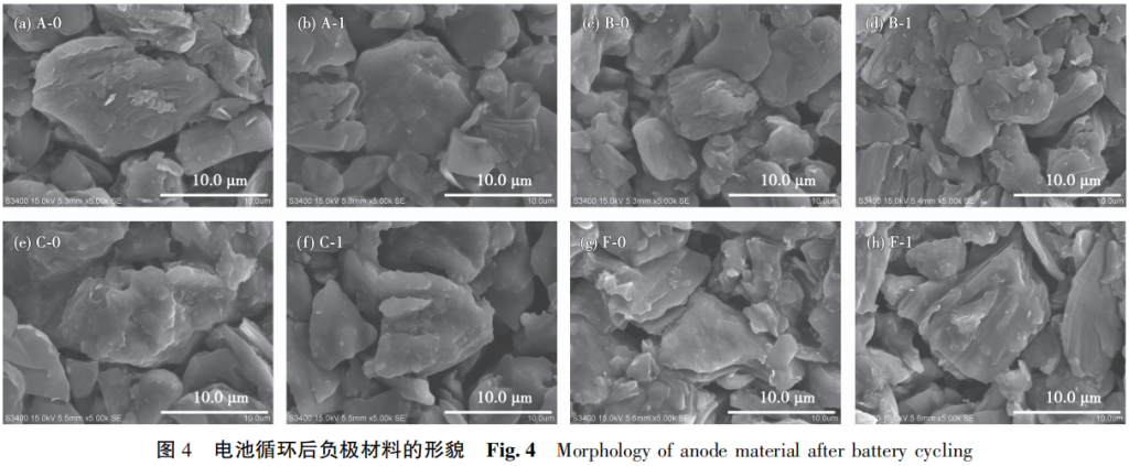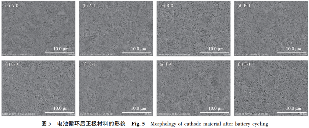 为进一步观察电池在不同电压下循环的变化,对电池进行拆解,观察正负极材料的变化,SEM 图如图4、5所示。