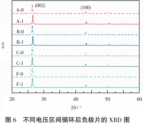 对负极片进行XRD分析,结果如图6所示。从图6可知,虽然电池在不同电压区间循环,但循环后的负极材料仍是石墨,并未产生其他新的物质。在同一电压区间,无夹具电池的负极极片(002)、(100)等特征峰都向低角度平移,说明石墨的晶胞参数变大,晶面间距变大。