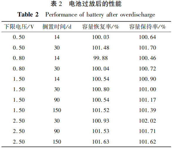 为进一步观察电池在长时间过放搁置后的容量变化,分别研究电池放电至规定电压0.50V、0.80V、1.50V、2.50V下,搁置一定时间后的容量保持和恢复的情况,见表2。