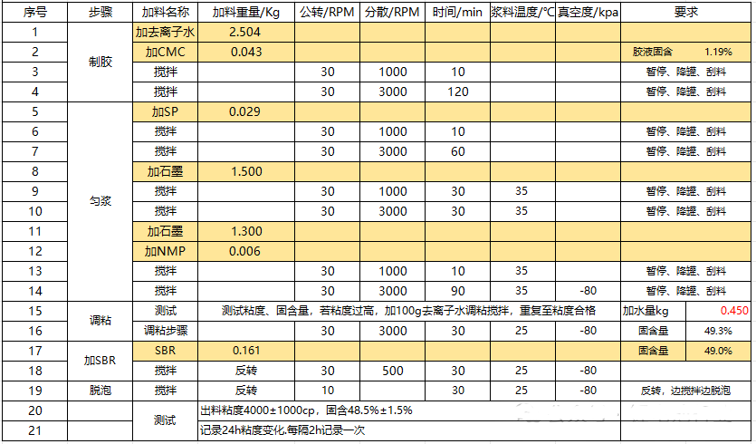 该工艺先制备CMC浆料,之后匀浆。我们可以看到,SBR在高速分散之后加入。