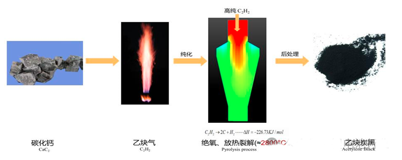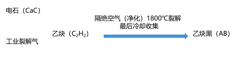 乙炔黑采用电石法制备,即先用电石制成乙炔气,经净化,使乙炔气在1400℃左右高温下隔绝空气进行裂解,再经冷却、收集而得。为什么叫乙炔黑呢?这与它的制备工艺有关。