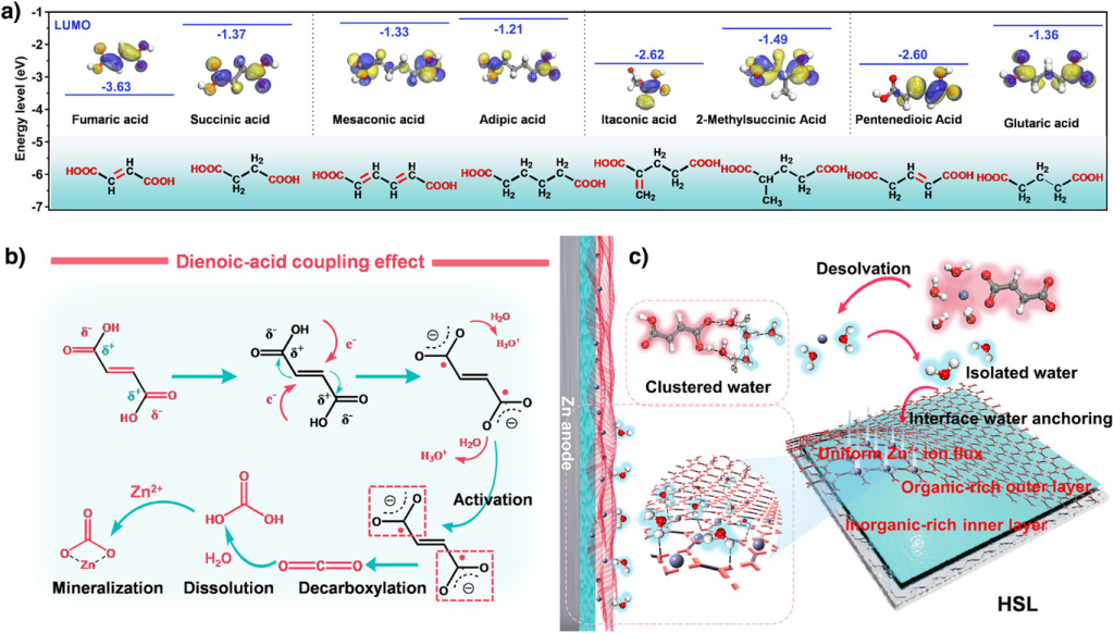 图1. 通过二烯酸偶联效应设计分级SEI的方法示意图。a)有无双键有机酸的LUMO能级比较。b)二烯酸偶联效应的自分解机理。c)HSL对界面活性H2O和均匀沉积的调节,以抑制Zn负极的HER和枝晶形成。