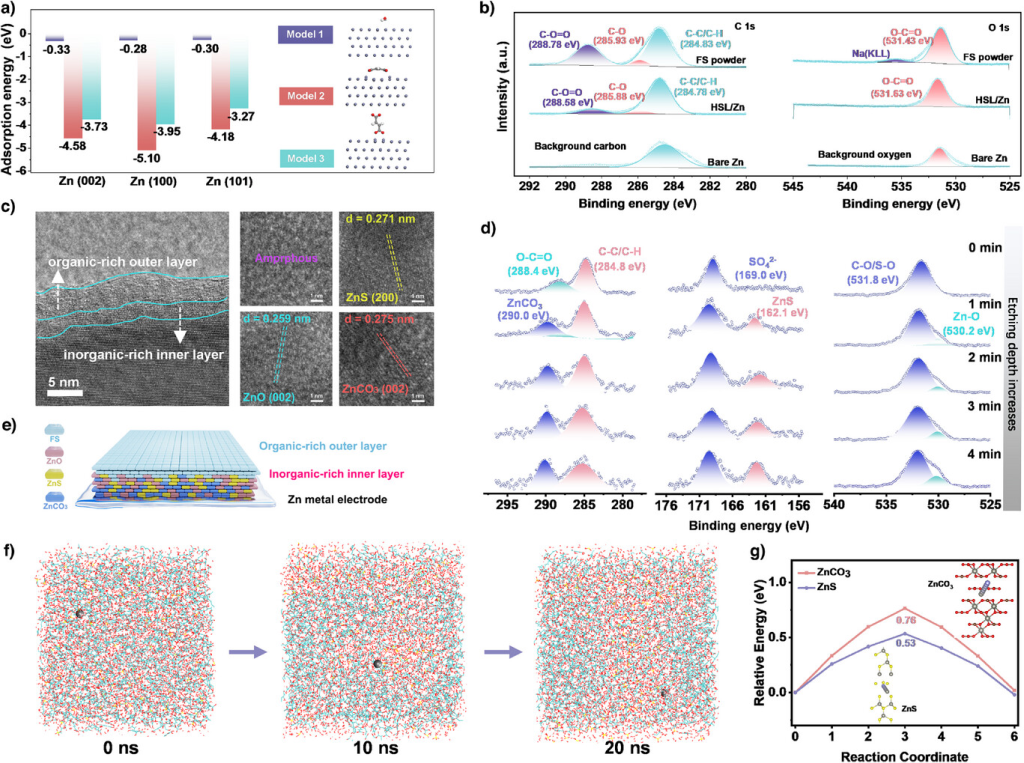 图2.HSL的形成机理和化学结构。a)FS和H2O在不同Zn平面上的吸附能比较。b)浸入ZS/FS溶液中的Zn负极的O1s和C1s。c)HSL在Zn表面的TEM图和相应的晶格条纹。d)不同蚀刻时间下HSL中C1s,S2p和O1s的XPS。e)具有分级分布的HSL示意图。f)HSL富含有机质外层中Zn2+的扩散路径模拟。g)计算的Zn2+在HSL的无机ZnCO3和ZnS组分中的传输能垒。