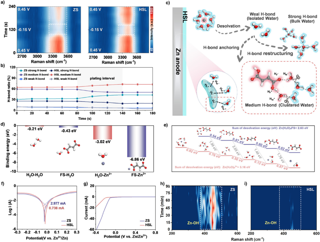图3. HSL对界面H2O的调控机理。a)扫描速率为5mVs−1,充放电状态下不同电压下的原位SERS。b)沉积过程中含有ZS和HSL的锌负极上强H键、中H键和弱H键的比例。c)电极/电解质界面处HSL的H键调控示意图。d)FS和H2O与Zn2+和H2O的结合能。e)含有ZS和HSL的锌负极在不同步骤中溶剂化团簇的脱溶剂能。f)含有ZS和HSL的锌负极的Tafel曲线。g)ZS和HSL的LSV曲线。h,i)5mAcm−2沉积过程中含有h)ZS和i)HSL的锌负极的原位SERS光谱。