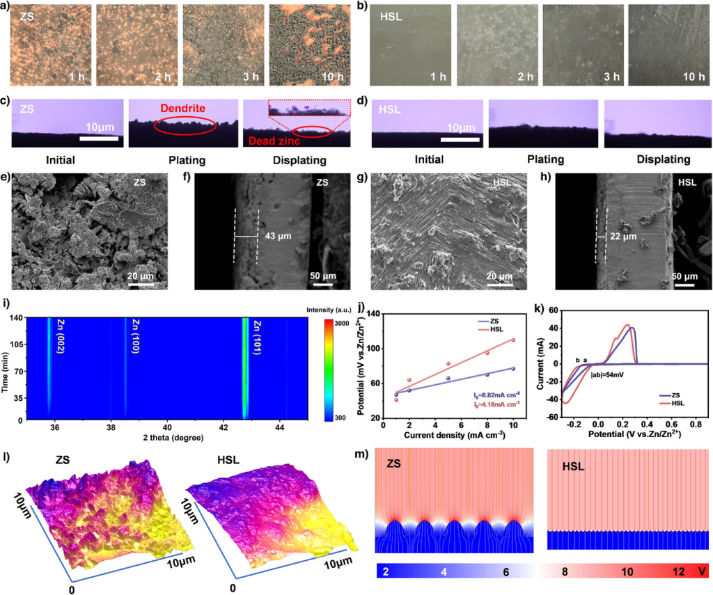 图4. HSL对沉积过程的调控。a、b)a)ZS和b)HSL镀锌的光学照片。c、d)c)ZS和d)HSL镀锌负极的原位光学显微镜照片。e-h)20个循环后ZSe、f)和HSLg、h)的锌负极的SEM图。i)电镀过程中HSL镀锌负极的原位XRD。j)交换电流密度和k)ZS和HSL镀锌负极的CV曲线。l)在2mAcm−2下2小时后ZS和HSL镀锌的AFM图。m)ZS和HSL镀锌负极的局部电场分布。