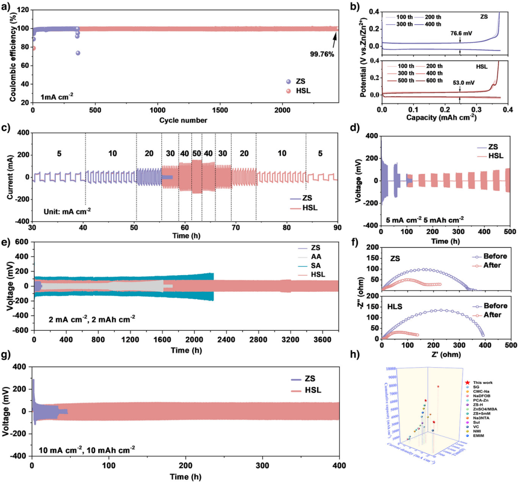 图5. 含HSL的锌负极的电化学性能。a)库仑效率和b)含ZS和HSL的锌负极的恒电流充放电曲线。c)含ZS和HSL的锌负极在5至50mAcm−2的倍率性能。d)含ZS和HSL的锌负极在5mAcm−2下,循环/静止间隔为24小时的循环性能。e)含ZS、AA、SA和HSL的锌负极在2mAcm−2和2mAhcm−2下的循环性能。f)含ZS和HSL的锌负极在2mAcm−2下循环前后的EIS光谱。g)含ZS和HSL的锌负极在10mAcm−2和10mAhcm−2下的循环性能。h)本研究与之前报告的性能比较。