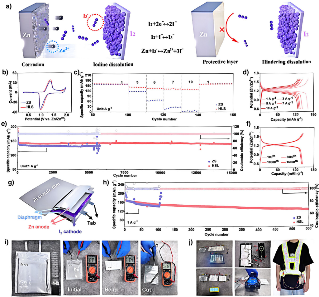 图6. 带HSL的Zn-I2全电池的电化学性能及实际应用。a)HSL对Zn-I2全电池锌负极的保护机理。b)带ZS和HSL的Zn-I2电池的CV曲线。c)带ZS和HSL的Zn-I2电池的倍率性能和d)相应的充放电曲线。e)带ZS和HSL的Zn-I2电池的循环性能和f)相应的充放电曲线。g)带ZS和HSL的Zn-I2软包电池的示意图和h)循环性能。i)带HSL的Zn-I2软包电池弯曲和切割前后的电压变化。j)由带HSL的Zn-I2软包电池供电的LED灯、智能手机、电子钟、遥控玩具车和工作服可穿戴仪器。