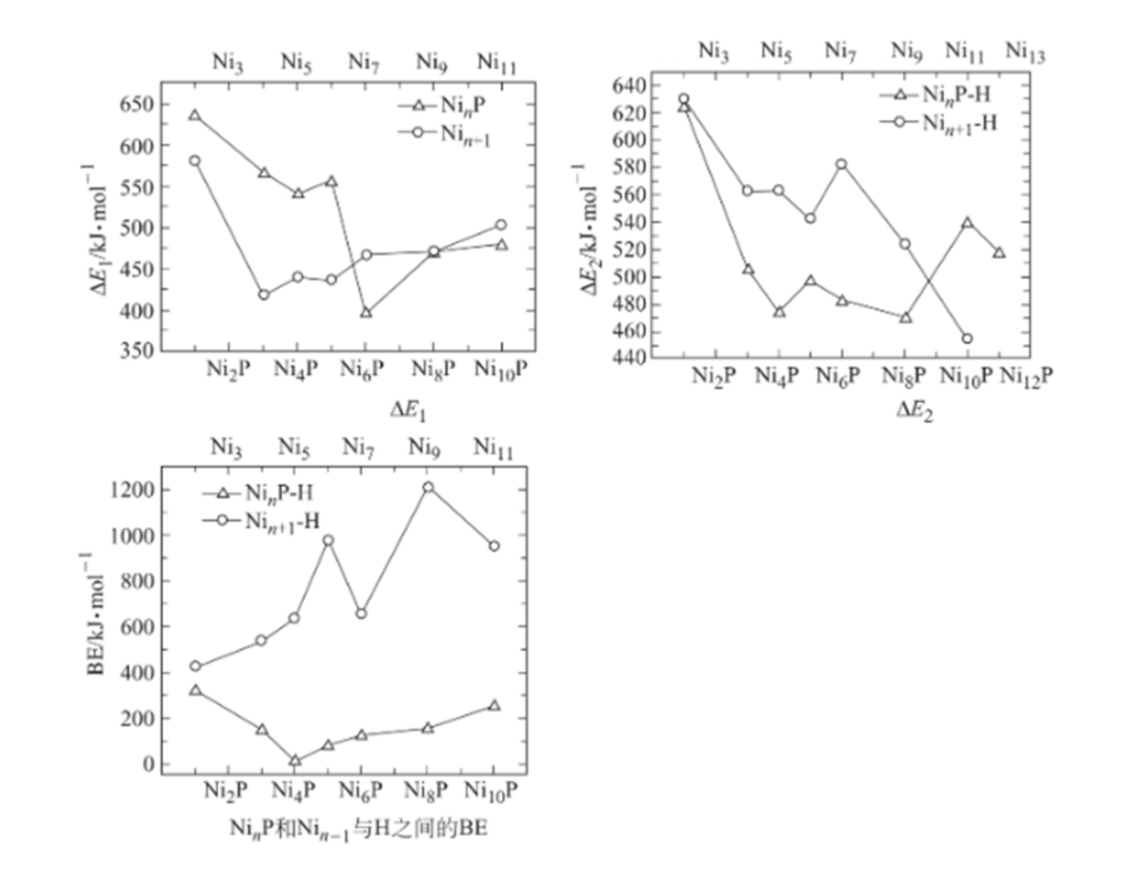c.无论Ni-P中P含量如何,Hads与Ni的结合能始终比Ni-P-H更强,表明在Ni上的氢脱附较Ni-P上困难。