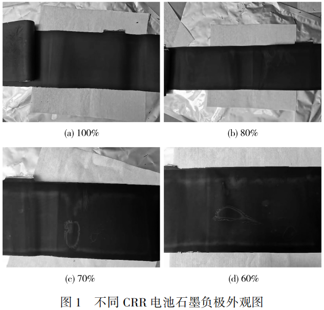 电池外观无破损,壳体有不同程度的增厚,拆开后发现电池壳内有剩余电解液。将电芯展开后,发现不同CRR电池的正极片表面无异常,而负极片外观图见图1。