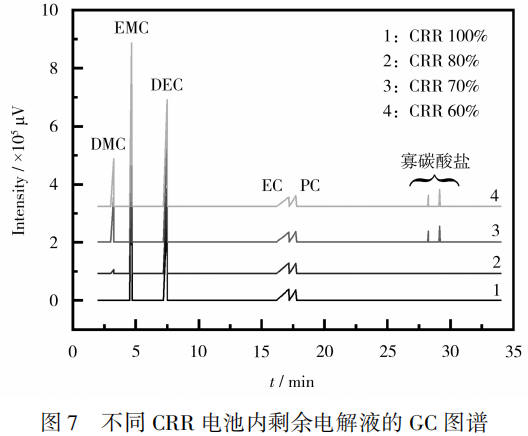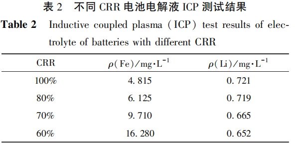 取CRR为100%、80%、70%和60%的电池,放电至下限电压后,在手套箱中拆解,收集电池内剩余的电解液。采用GC-MS进行电解液组分定性测试;采用GC进行电解液组分定量测试;采用ICP进行电解液中铁离子和锂盐浓度测试。