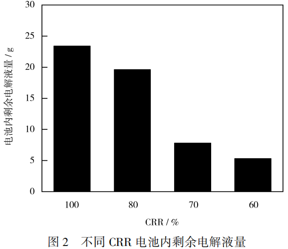 从图2和图3可知,随着CRR的降低,电池内残余电解液量逐渐减少,与CRR为100%相比,CRR为80%的电池内自由电解液残余量减少了16.2%,而CRR为60%的电池内自由电解液残余量减少了77.3%,说明电池多次循环使用会加速电解液的消耗。