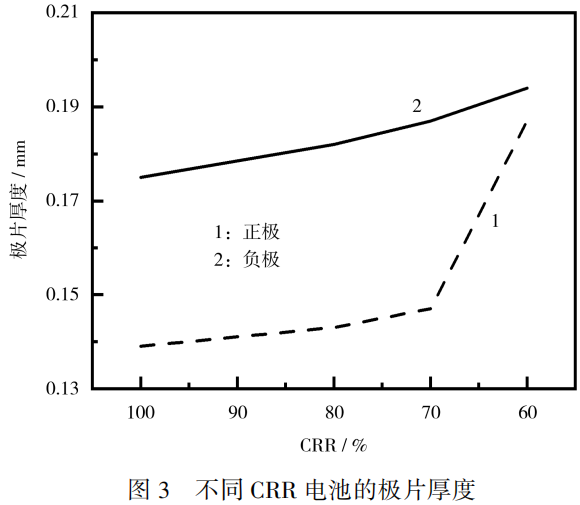 同时,随着电池CRR的降低,正极片与负极片的厚度均逐渐增加,在电池容量衰减到80%之前,负极片厚度增速快于正极片的,而在80%到60%区间,正极片的厚度增速反超负极片的。与CRR为100%相比,CRR为60%的电池正极片厚度增厚接近50μm,大于负极片厚度的增加值20μm。