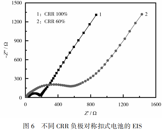 将CRR为100%、80%、70%和60%的电池,放电至下限电压后,在手套箱中拆解,取出负极片,裁成直径12cm的圆片。将正极片、负极片、隔膜和电解液组装成CR2032型对称扣式电池。对称扣式电池以0.20C放电至电压下限后,搁置30min,用电化学工作站进行电化学阻抗测试。