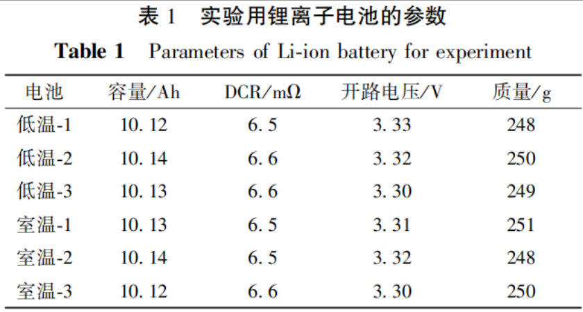 实验前,各样品先进行恒流-恒压(CC-CV)充电,即以1.00C充电至3.65V,转恒压充电至0.05C,再进行1.00C恒流(CC)放电至2.30V,循环3次,以评估电池的实际可用容量,并筛选出一致性较好[放电容量差异在±0.1Ah以内,直流内阻(DCR)差异在±3mΩ以内]的6只电池,分成低温实验组和常温对照组。上述充放电均在室温下进行。用 电池内阻测试仪分别夹到对应的电池正负极极耳,测量100%荷电状态(SOC)电池的DCR。
