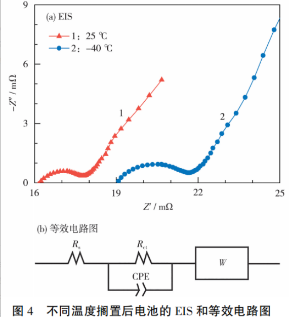 在低温搁置后,电池的阻抗上升,Rs增长率为16.18%,Rct也明显增大。这是因为低温降低了电池内部的化学反应速率,使Li+的嵌脱受阻,导致电池阻抗增大。